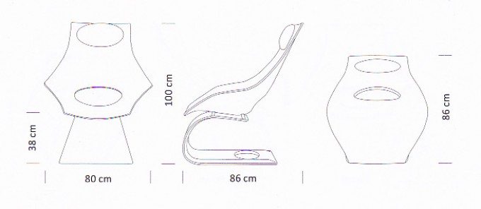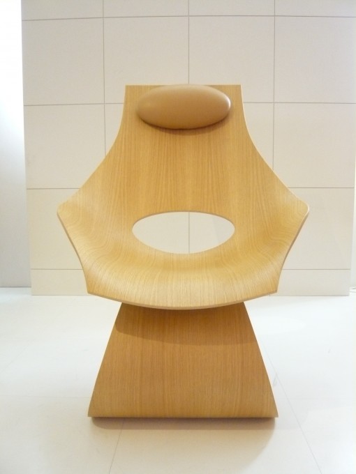 『ドリームチェア』 は、三次元に湾曲した2つの成型合板で構成。座面と背の部分は一体になっており、厚さ約1cmの六角形の板を曲げ加工し、背の下の部分に楕円形の穴が開いています。頭の部分には、穴と同じ楕円形のヘッドレスト。